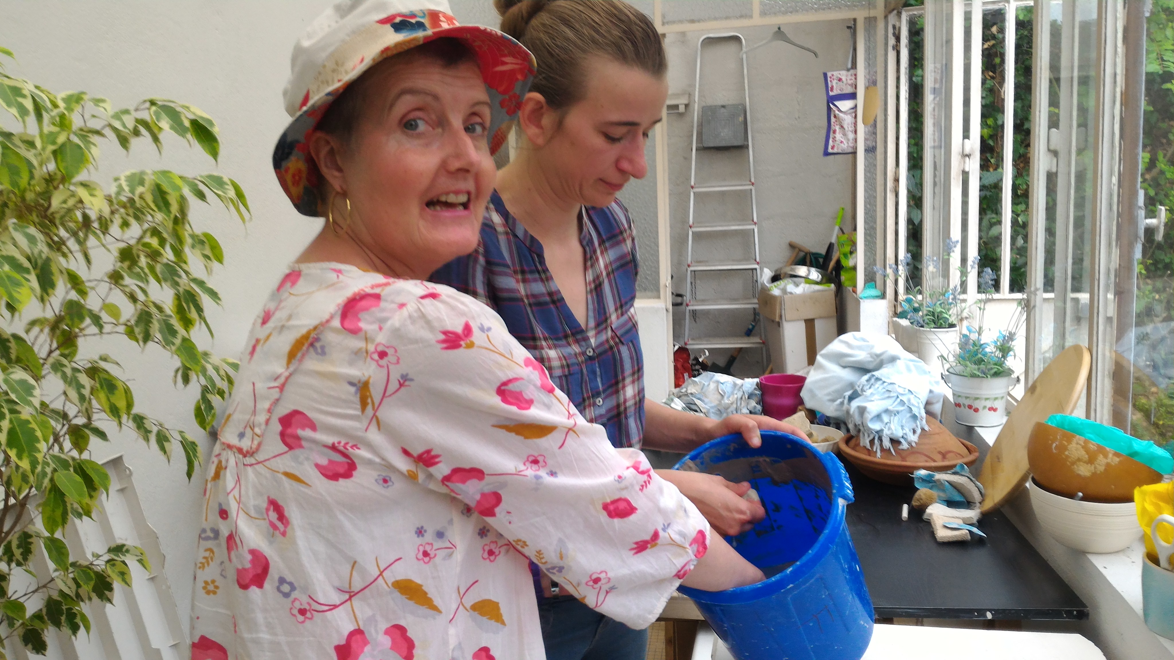 On Tuesday Hélène visited. Hélène has been teaching Lindsey to turn over the past few years. To turn, as in pottery. Hélène has agreed to come to the house and help Lindsey get back on her wheel. This may seem simple but requires a lot of strength and skill, so it is quite a challenge. On Tuesday they seem to have spent most of the time speaking and getting ready but still accepted to pose as I had asked to have at least one photograph taken for the blog.