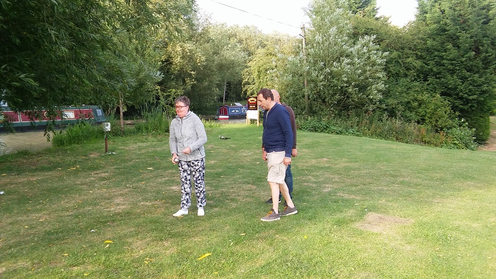 On Monday we managed an early start (2pm) and we went up to Long Itchington were we moored for the night close a lovely pub. Pétanque was on the programme before dinner.