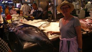 Tuesday we went to Santander market. The excuses was that at that point Luisa was worried that having missed their flight in Alicante, they could be black-listed for the return, so we had to go the Sevy Ballesteros airport again to check (all went fine). I never saw such a fish market as the one in Santander. We chose 4 lobsters and two Tuna (Bonito del norte). I froze some bonito and cooked the lobster which we had for dinner.